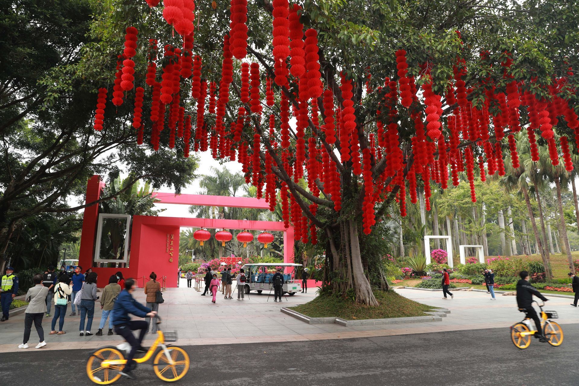新春赏花是市民喜爱的游玩项目。深圳各大公园园道旁、大树上也已悬挂起串串红灯笼,主要出入口和重要节点设置了“欢度春节”等主题花境,一派绚丽缤纷的节日氛围。市公园管理中心副主任梁治宇表示,深圳公园共布置主题花境105处,花卉景观约4.3万平方米,悬挂大小灯笼12.4万余个(串)。各大公园按照“美观、生态、可持续”的原则,强调花境的持续性和自然生态特点,以多年生开花灌木、宿根花卉为主,搭配适量时花,让市民体验优美、自然、和谐的公园节日景观。