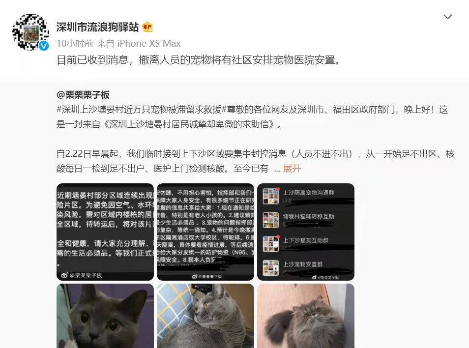 同时,记者在深圳市流浪狗驿站官方微博号上获悉,该组织已连发两条微博回应搬迁居民的宠物安置问题,表示:“社区已委托宠物医院安置撤离人员的宠物,请相互转告。”