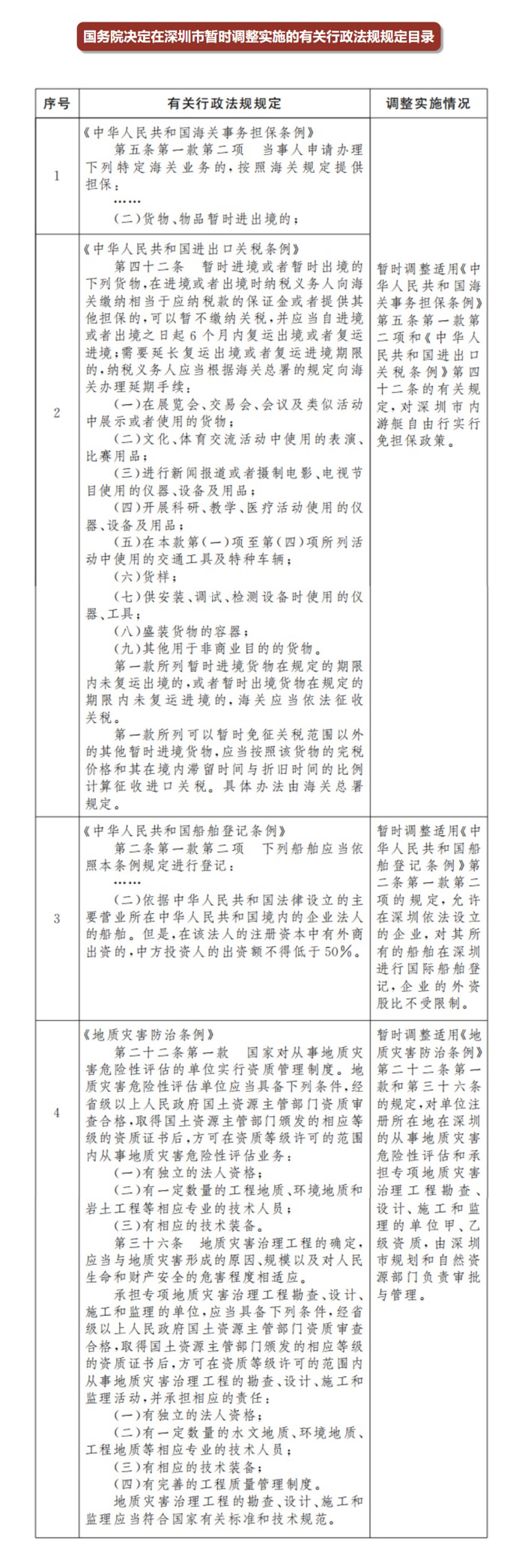 3月17日,《国务院关于同意在深圳市暂时调整实施有关行政法规规定的批复》(国函〔2022〕15号,以下简称《批复》)正式在中国政府网发布,在深圳市暂时调整实施《中华人民共和国海关事务担保条例》《中华人民共和国进出口关税条例》《中华人民共和国船舶登记条例》《地质灾害防治条例》4部行政法规的有关规定(详见附件)。这是深圳自建市以来,国家首次在深圳暂时调整实施行政法规,是贯彻落实党中央关于支持深圳实施综合改革试点的重要举措,有利于把改革决策同立法决策更好结合起来,保障深圳综合改革试点各项改革举措于法有据。