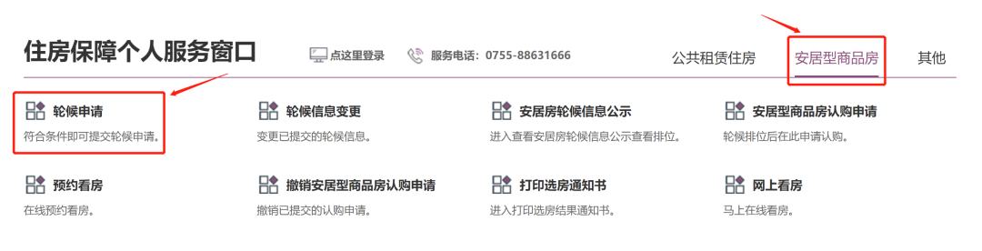 进入后,点击【安居型商品房】处的【轮候申请】,然后登录,点击【申请轮候】