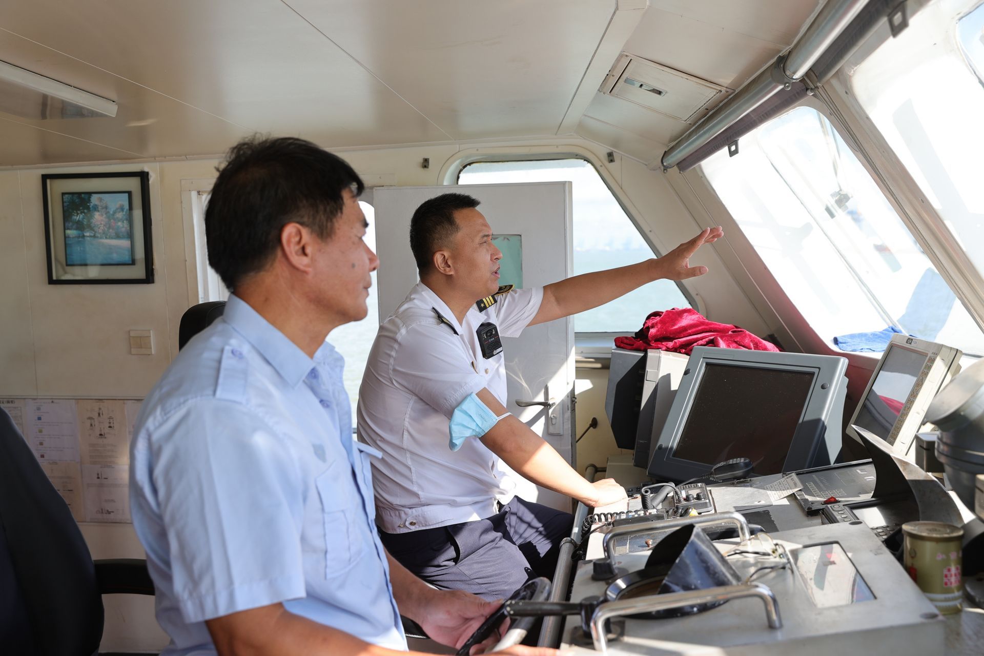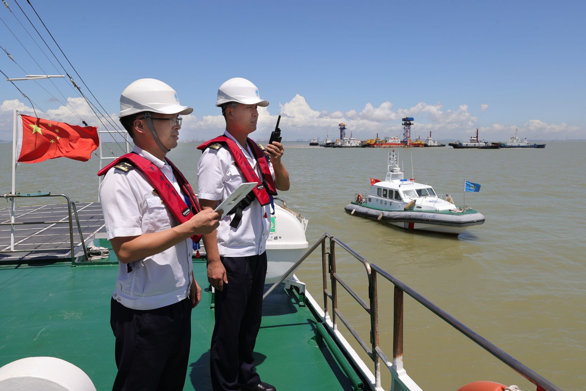 21日,深圳宝安海事局副局长许广岩(左二)、机场海巡执法大队副队长朱华东(左一)在海巡1461船上,通过对讲机指挥。(深圳特区报记者 周红声 胡蕾摄)