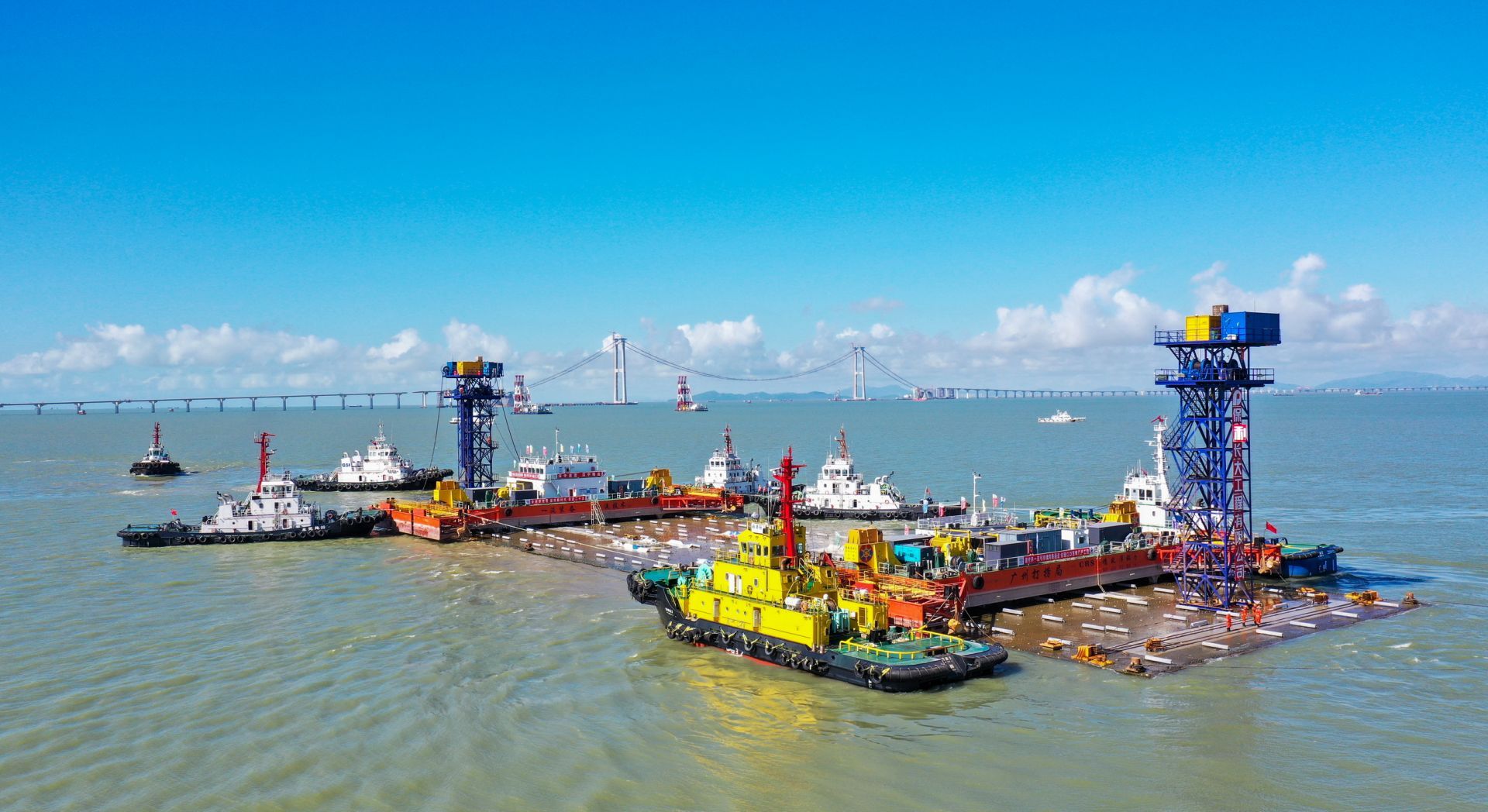 7月20日晚,拖航编队提带管节,在广东海事局、深圳海事局的保驾护航下,跨越珠江口截面交通流量超1000艘次的繁忙航道,于21日12时23分到达施工水域。