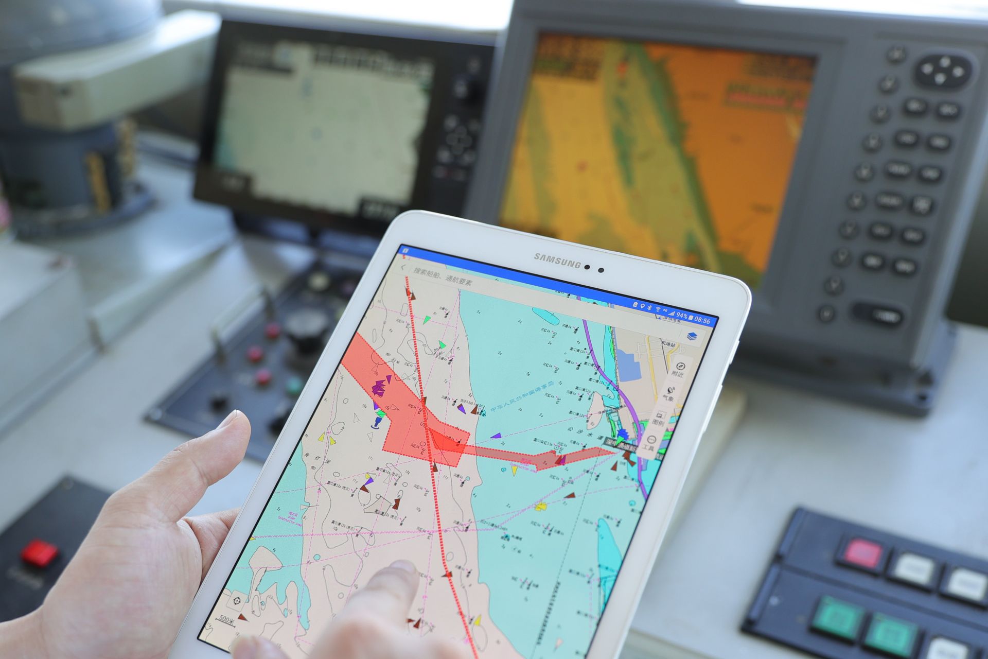朱华东用手里的平板监测浮运船队和周边船只情况,图中红色方框区域是浮运船队的施工拖运航道,红色细线是矾石航道。此时还没有封航,仍然可以看到船只通过航道。矾石航道是粤港澳大湾区最重要的水上通道之一,全长29.13公里,串联了广州港沿海港区、中山港、东莞港、深圳港西部港口和香港航运中心。(深圳特区报记者 周红声 胡蕾摄)