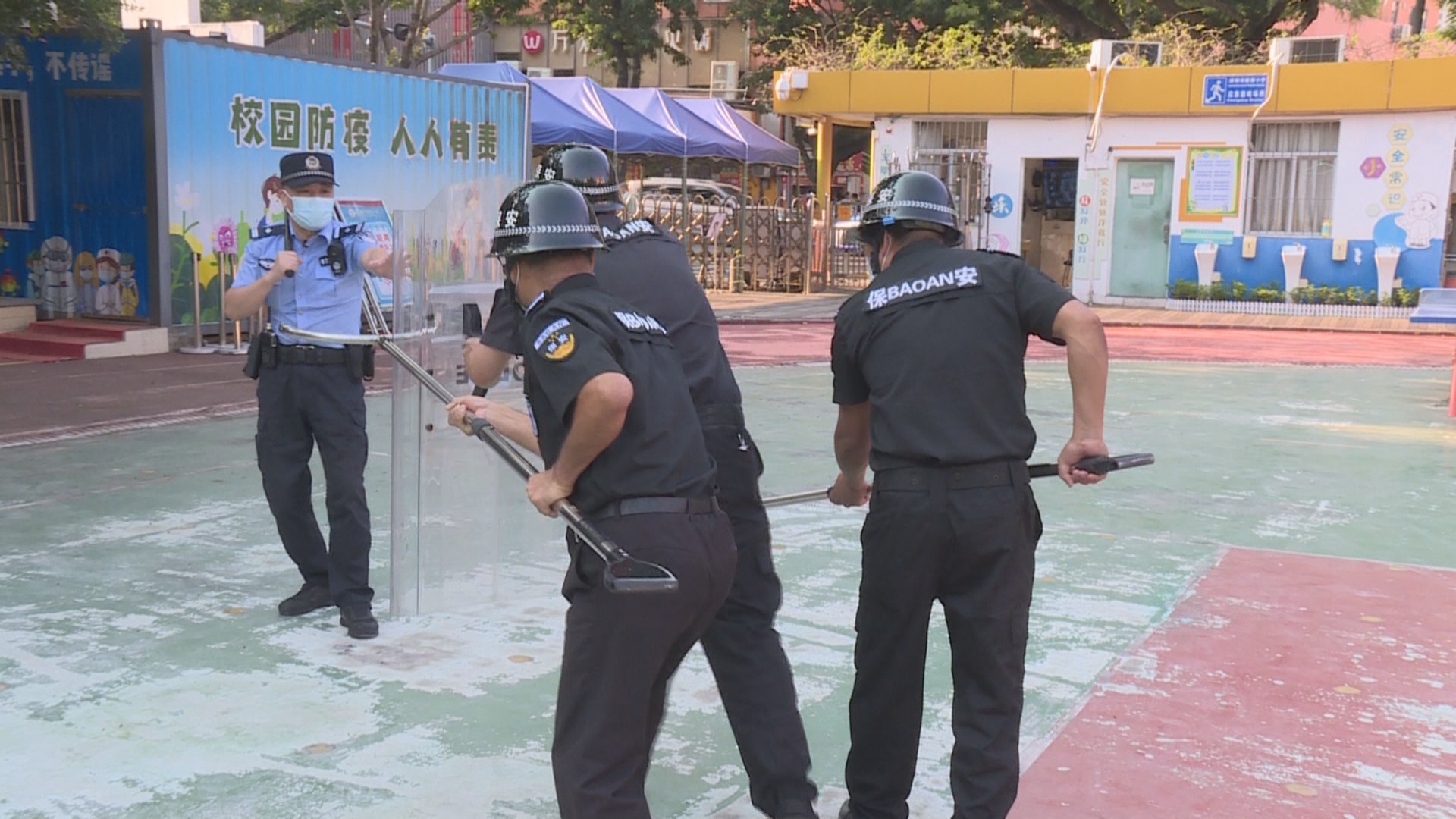 随着新学期的到来,做好校园的安保工作尤其重要,刘锋组织安保人员开展模拟演练。主要是对外来人员进出校园的管理、上放学高峰期护学岗联勤联动、校园突发事件应急处置的演练。
