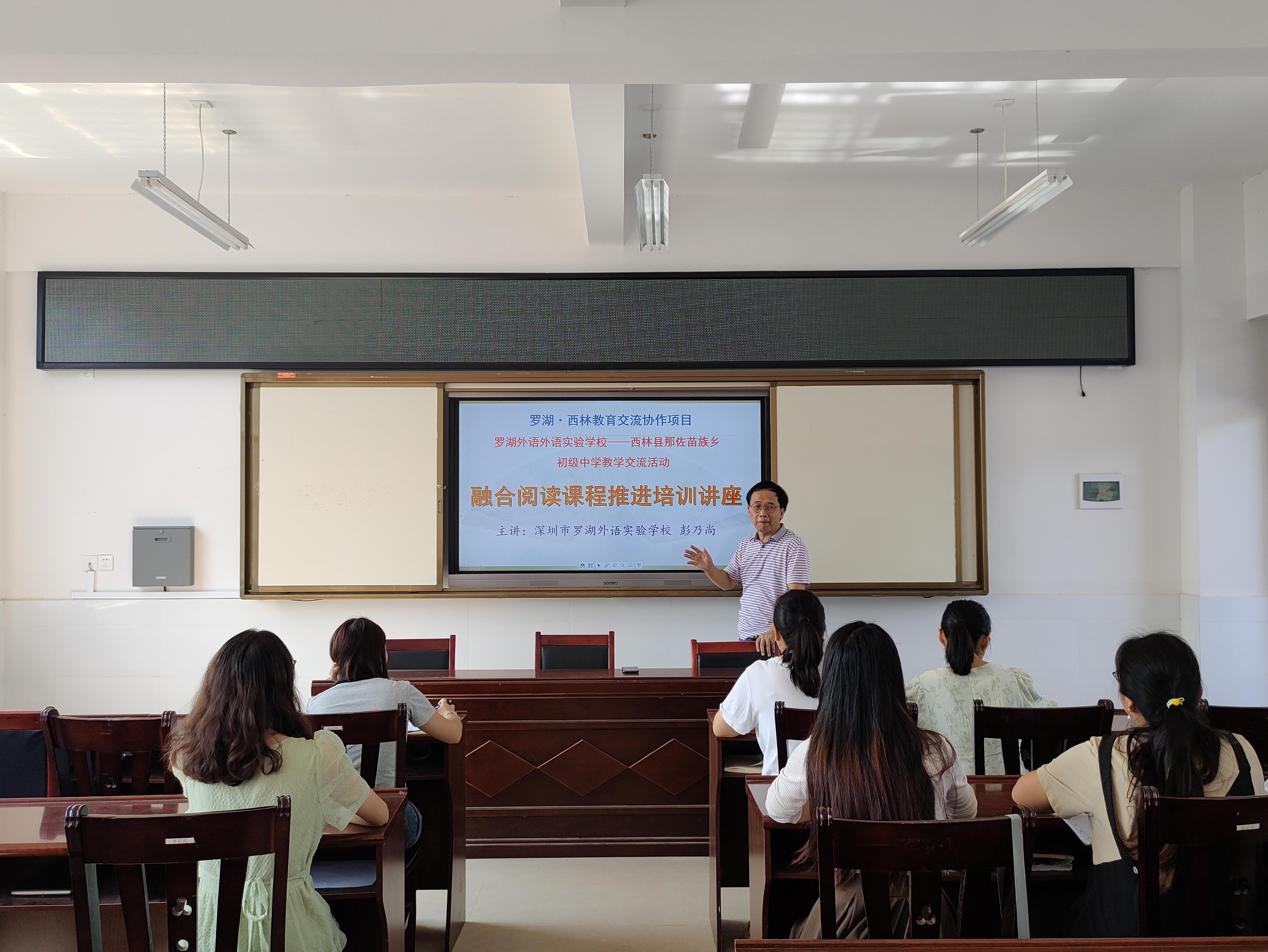 在知识、信息发生“爆炸”的时代,对阅读的速度、广度、深度、融合度要求越来越高,阅读越来越重要。西林县在罗湖区支教团队力量的支持下,正在部分中小学推进融合阅读课程。彭乃尚老师利用这次交流活动的机会,为那佐苗族乡初级中学的文科教师进行了“融合阅读”推进培训讲座,他针对阅读课难以取得较好效果和难以长期坚持的问题,从课程意义、课程内容设置、有效阅读的方法、如何做读书笔记、如何激发学生阅读的积极性等方面与那佐苗族乡初级中学的老师们进行交流探讨。彭乃尚老师还向那佐苗族乡初中赠送了他编写的《融合阅读教程》。老师们表示,经过培训,对在本校开设语文阅读课有了更足的信心。