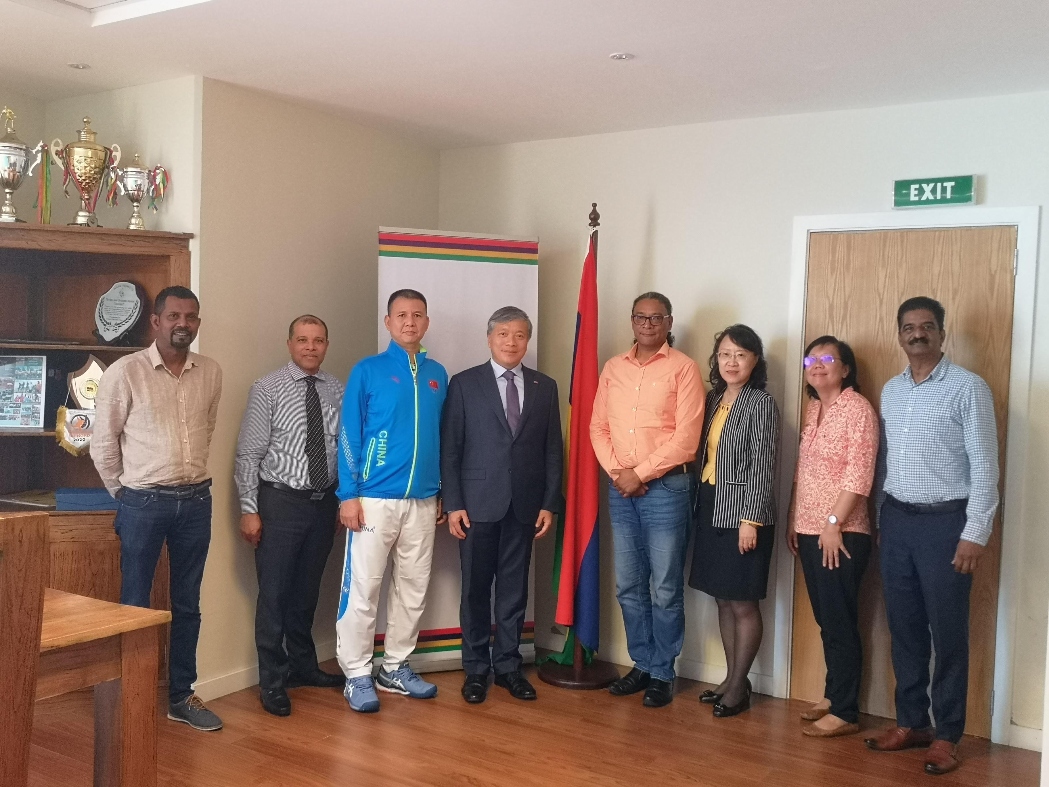 李志军(左三)在毛里求斯青年赋权、体育和休闲部长(右四)办公室受到接见,中国驻毛里求斯大使朱立英(左四)参加会见