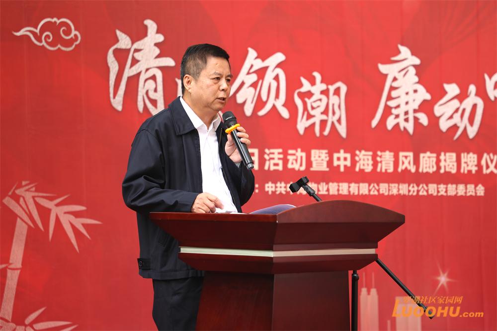 罗湖家园网讯:为传承家风故事,弘扬家风文化,11月14日,以“清风领潮 廉动中海”为主题的“中海清风廊”揭牌仪式在桂园街道中海·鹿丹名苑举行。深圳市国资委党委办公室二级调研员张学亮,桂园街道党工委委员、党建工作办公室主任苏媛媛,桂园街道服务中心主任鹿丹村社区第一书记刘章,中海集团监察部总经理丁志刚,中海物业副总裁朱毅坚,中海·鹿丹名苑党支部书记官国安,业主代表唐桂生等出席活动。