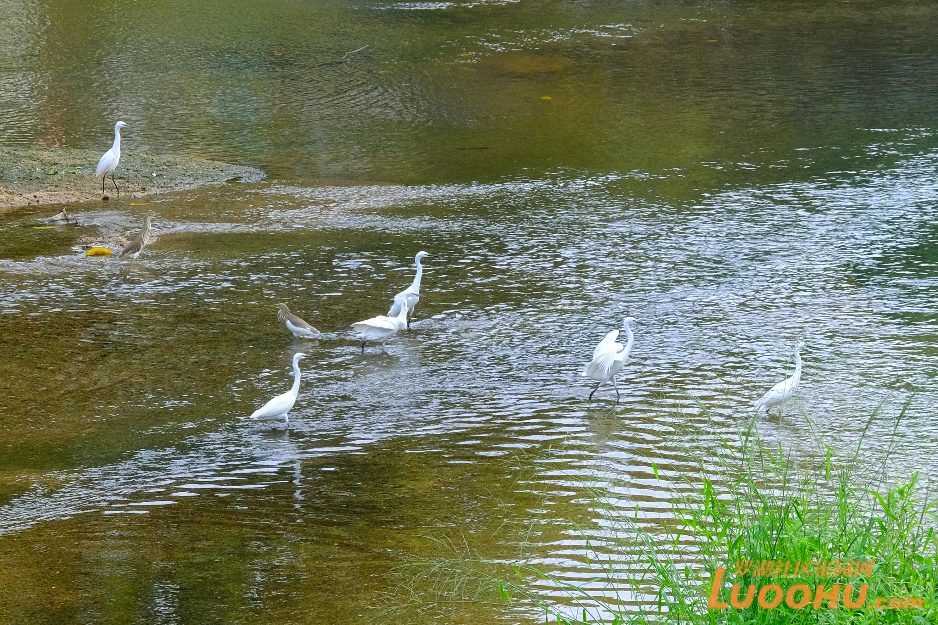 几只白鹭在浅水处戏水打闹。
