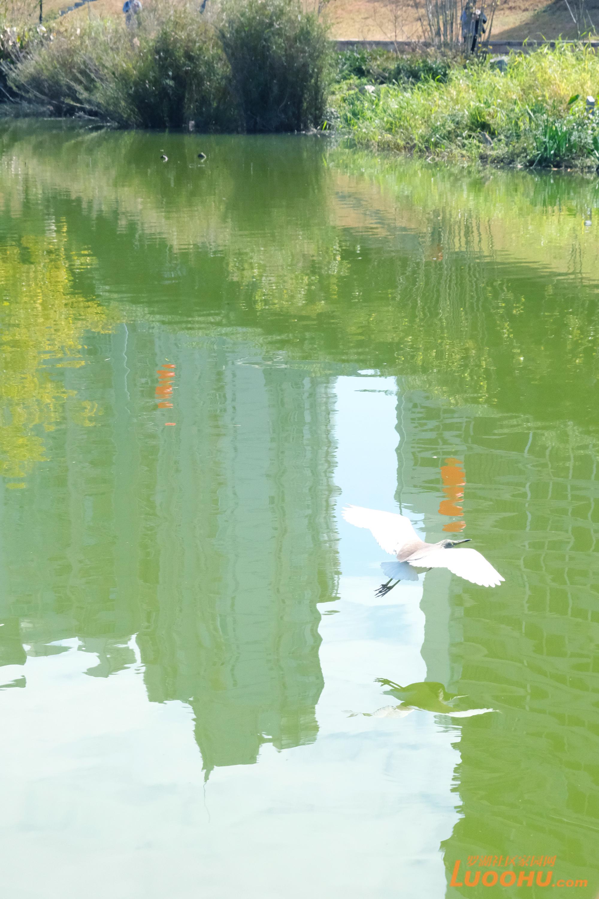 公园内水清岸绿,一只白鹭在湖面上展翅飞翔。