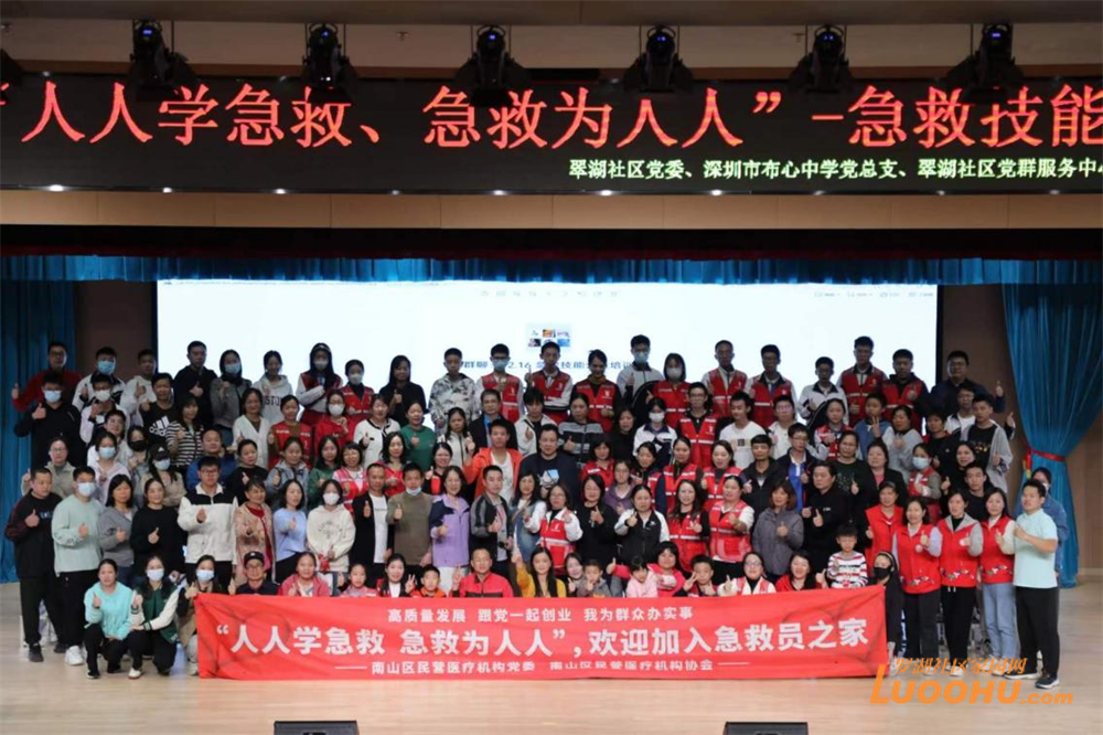 罗湖家园网讯:为普及急救知识,提升辖区居民应对突发意外伤害的紧急救援能力,12月16日,在东湖街道翠湖社区党委大力支持下,翠湖社区党群服务中心联合深圳市布心中学党总支和南山区民营医疗机构协会开展了“人人学急救、急救为人人”——急救技能公益培训,120余名辖区居民参与培训。