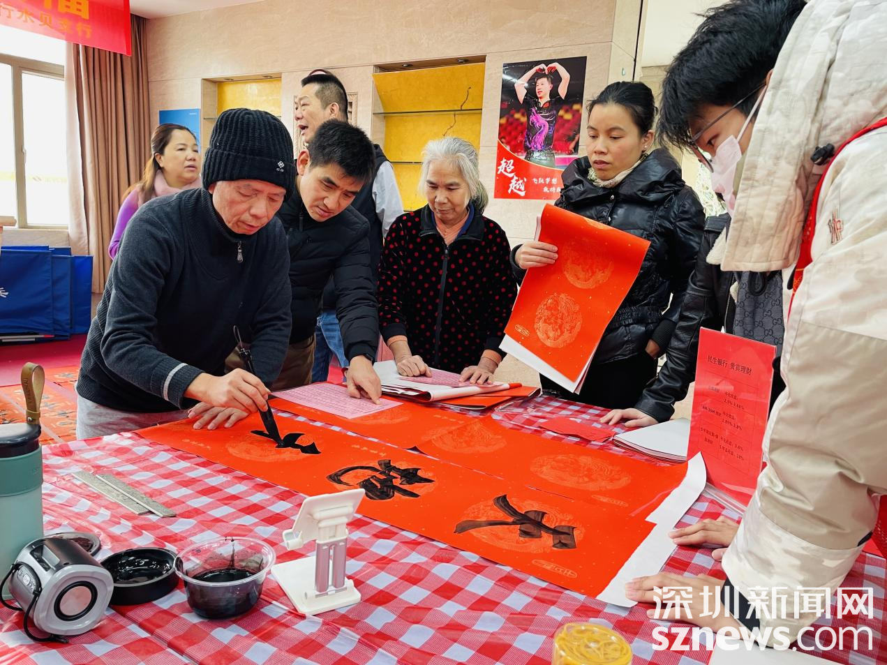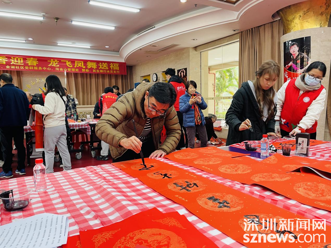 罗湖家园网讯:春节将至,年味渐浓,为发扬中华民族传统节日文化,推进文化自信自强,丰富居民的精神文化生活,营造喜庆祥和的春节氛围,1月28日下午,金湖社区党群服务中心联合淘金山物业、民生银行水贝支行开展一场“翰墨飘香迎春 龙飞凤舞送福”——金湖社区2024年写春联、送春联活动,活动现场共送出300副深受群众喜爱的新春对联。