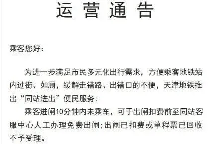 即乘客持同一票卡在同一车站的进出站时间间隔在10分钟(含)以内,予以免费进出。