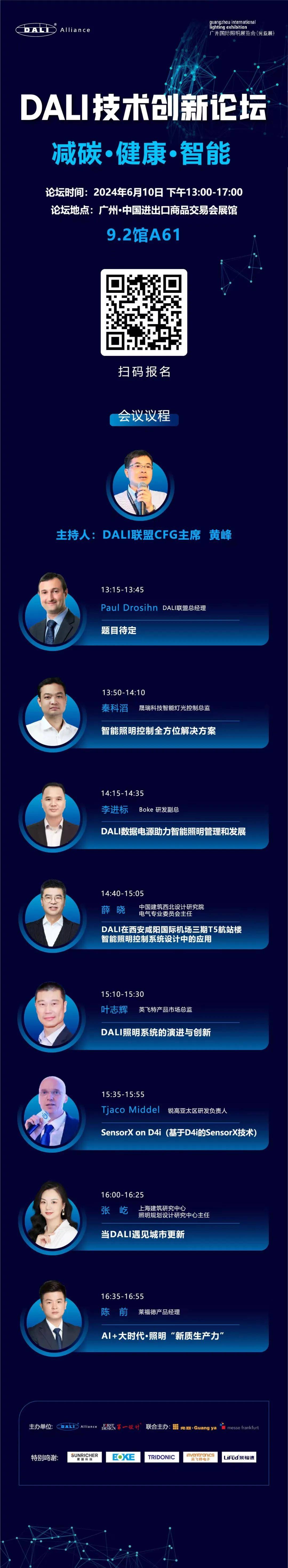 由广州国际照明展览会(GILE)和 DALI 联盟联合主办的『DALI 技术创新论坛』将于 2024 年 6 月 10 日 13:00-17:00 在广州中国进出口商品交易会展馆 9.2 馆 A61 举行。