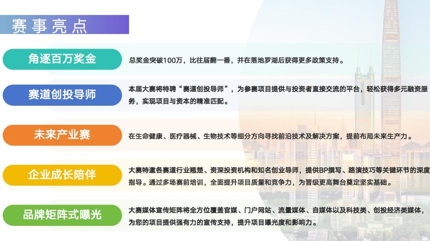 罗湖区自2017年起连续七年举办中国深圳创新创业大赛罗湖预选赛区赛事,累计吸引2604个项目参赛,涵盖团队与企业组。赛事汇聚了众多投资机构及技术专家,共助力193个项目获得扶持。本届大赛在延续往年赛事“创新、创业、创投、创赛”四创联动特点的基础上,增加以下亮点:一是未来赛赋能大健康产业——从生命健康、医疗器械、生物技术等方向优化提升产业链,提前布局未来生产力,培新育强。二是奖金再创新高——总奖金突破100万元,比往届翻一番,未来赛获奖项目还有机会享受由中欧创新医药与健康研究中心提供的400小时实验室使用权。三是网罗市外优质项目——罗湖预选赛区特别设置了北京、香港等市外团队项目参赛通道,旨在汇聚市外重点高校院所优势创新资源,联合京津冀、粤港澳大湾区科技创新力量共同推动新质生产力发展。四是“创”+“投”深度融合——引入“赛道创投导师”提供全程服务,推动项目与资本精准匹配。此外,通过品牌矩阵式曝光,为项目提供宣传支持。