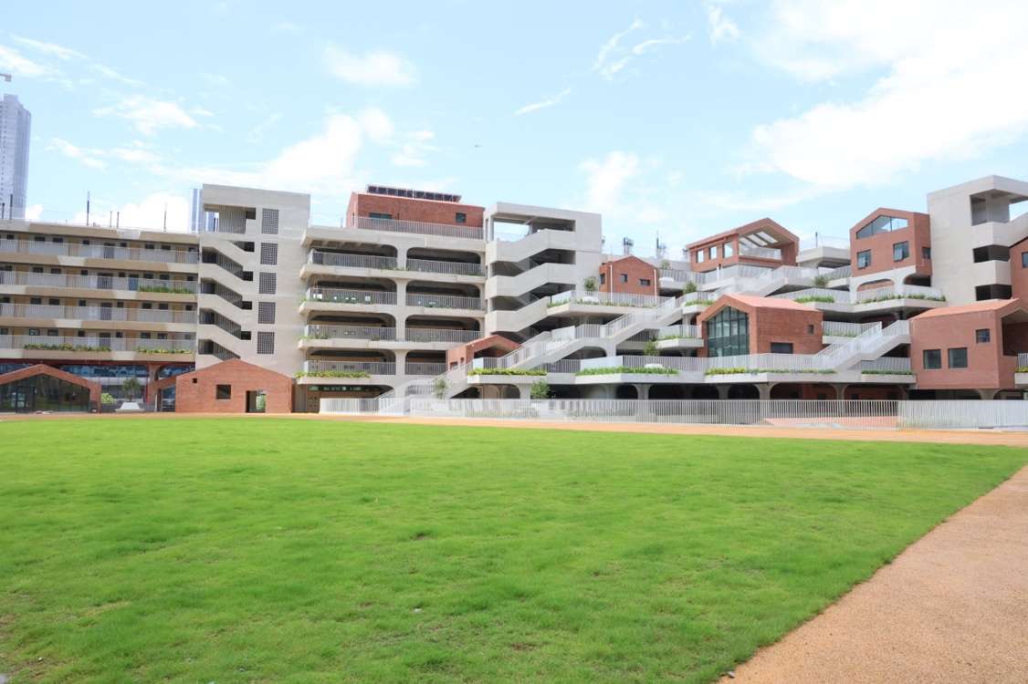 俯瞰校园,一座“叠落的山谷”引人入胜。层层挑空和退台尽显“延伸的空中花园”设计巧思。错落有致的结构和绿色植被相得益彰,形成“人造山地”,与风景秀丽的梧桐山自然山体相映成趣。