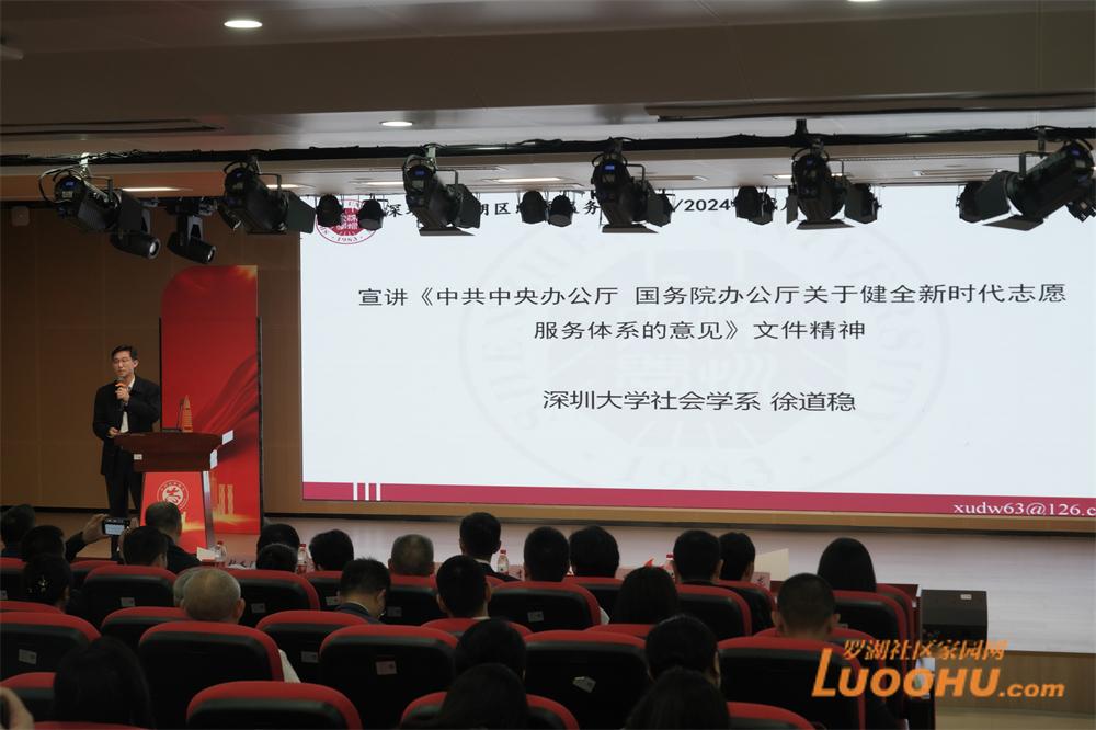 志愿服务是现代社会文明进步的重要标志,罗湖作为改革开放发源地和志愿服务先行区,在20世纪90年代就成立了全国首家区级志愿者组织,在区委、区政府高度重视和市民群众广泛参与下,目前全区在册志愿者超33万名,各类志愿服务组织队伍1421支,涌现了黄贝街道文华社区省级“最美志愿服务社区”(2020年),“星星学堂”中国青年志愿服务项目大赛全国赛“银奖”项目(2022年)等一批志愿服务典型,充分展示了罗湖志愿服务的深厚底蕴和优良传统。活动现场,深圳大学社会学院徐道稳教授为与会人员宣讲了《中共中央办公厅 国务院办公厅关于健全新时代志愿服务体系的意见》文件精神,罗湖区志愿者联合会发布了罗湖区志愿服务2024年度报告,理论指引方向、实践凸显成效,展现了党委社会工作部引领下的罗湖志愿服务新风貌。