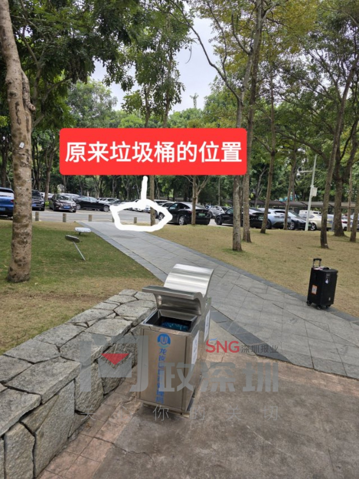 龙岗区青林路龙城公园北门停车场处,之前公园引进了麦当劳,就把垃圾桶从停车场搬过来为了方便放垃圾,如今麦当劳搬走了。
