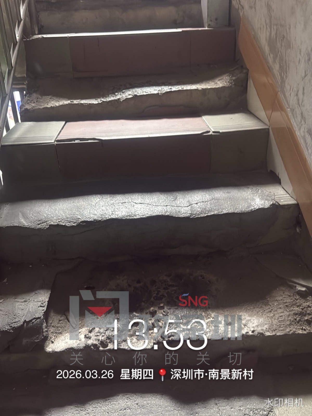 2026年3月26日,民治街道樟坑社区工作人员前往南景新村一区15栋核实情况,发现一楼通往二楼的楼梯台阶破损、内部墙面墙皮脱落。工作人员现场约谈物业管理处负责人,要求其高度重视、及时响应居民诉求,并立即落实整改。管理处负责人表示,台阶破损问题马上安排工程部处理,墙面脱落问题将与楼栋业主管理方协商,尽快推进解决。经社区持续跟进,工程人员当日下午已完成台阶修复,现场拉设警戒线警示,待水泥完全干透后即可恢复正常使用。针对墙面脱落问题,社区将继续跟进,直至问题彻底解决。同时,民治街道樟坑社区已要求物业管理处举一反三,对小区各楼栋楼梯及公共设施进行全面排查,及时修缮消除类似安全隐患,切实保障居民出行安全。感谢您对我们工作的理解和支持!