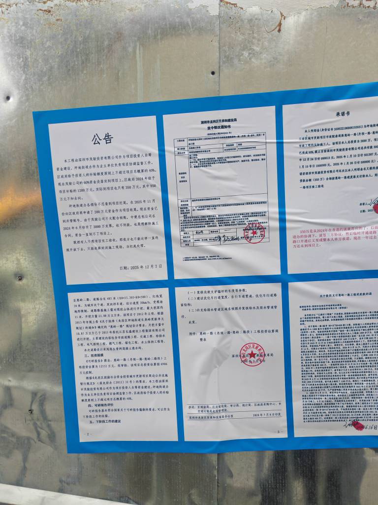 根据现场张贴的《承诺书》显示,实际施工人何**为坪地街道长美岭工业区城市更新项目市政配套道路惠岭一路(丹坝一路—惠岭二路段)市政工程的实际施工人,项目总投资2690万元,已完成95%进度。但截至2025年4月,深圳市茂*投资有限公司仅支付300万元工程款。承诺书明确标注:"此次开通是坪地街道办协商下临时开通的,如2025年9月20日前还是解决不了,此通道将于2025年9月20日再次封闭。"